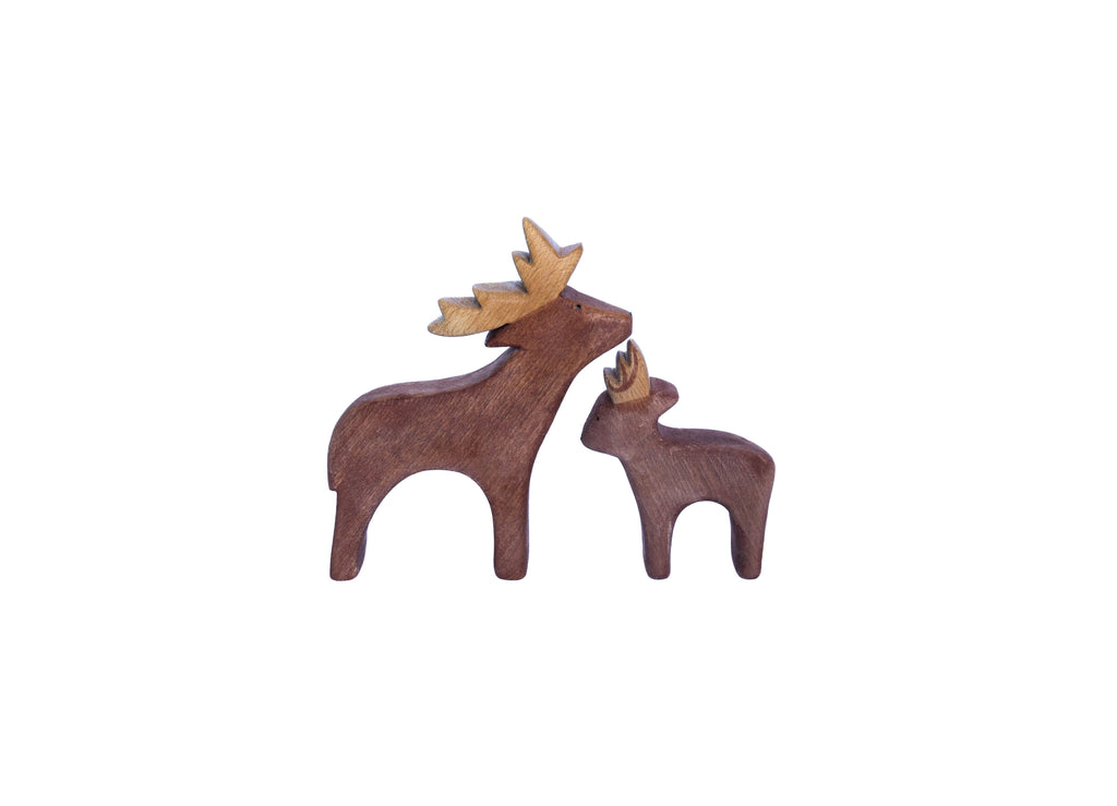 Hirsch und Hirschkalb sind aus hochwertigem Buchenholz gefertigt, mit natürlichen, wasserbasierten Farben bemalt und mit natürlichen Ölen veredelt.