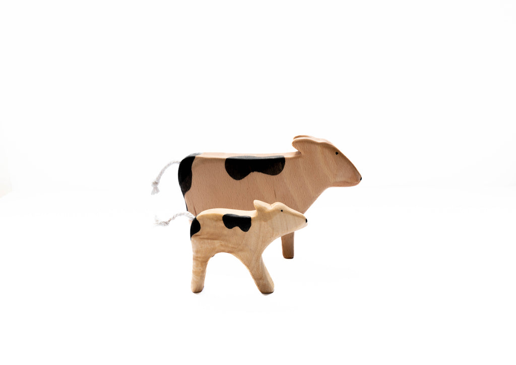 Kuh und Kalb sind aus hochwertigem Buchenholz gefertigt, mit natürlichen, wasserbasierten Farben bemalt und mit natürlichen Ölen veredelt.